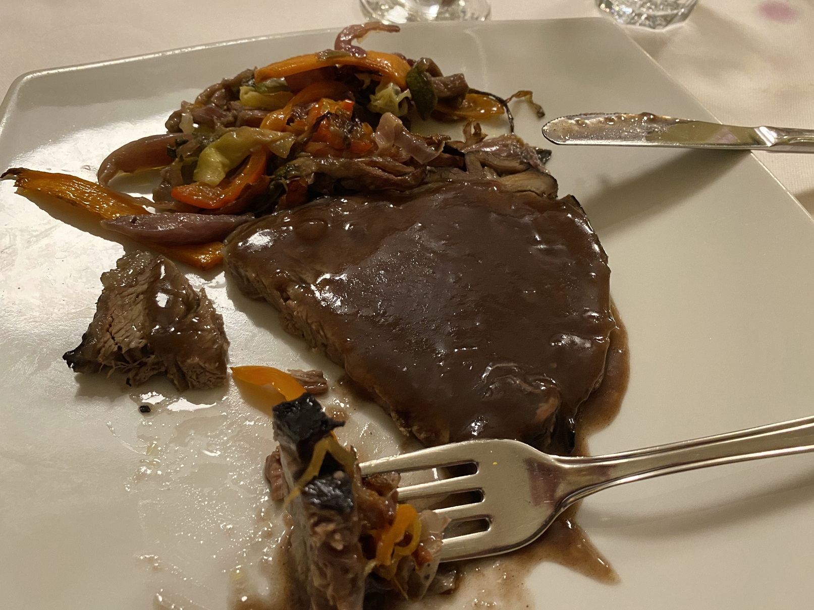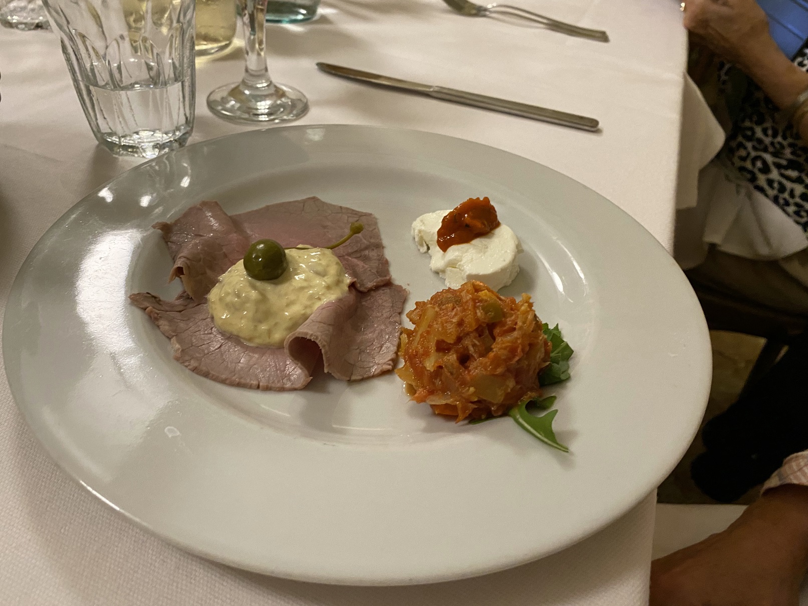 Course 1: veal tonnato (tuna sauce), cheese with a tomato puree, and a giardiniera.