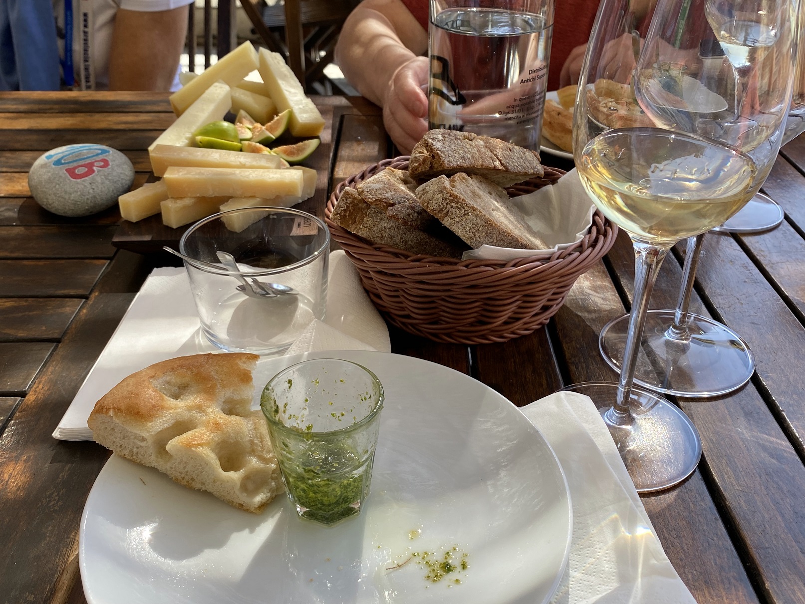 Some focaccia bread with a pesto, and of course more meat and cheese. Oh, yes, and wine for lunch.
