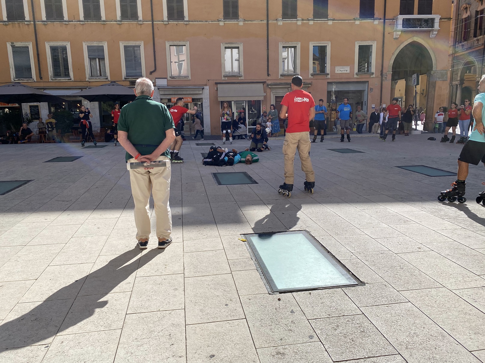 Hard to see, but these were rollerbladers doing stunts in the square.