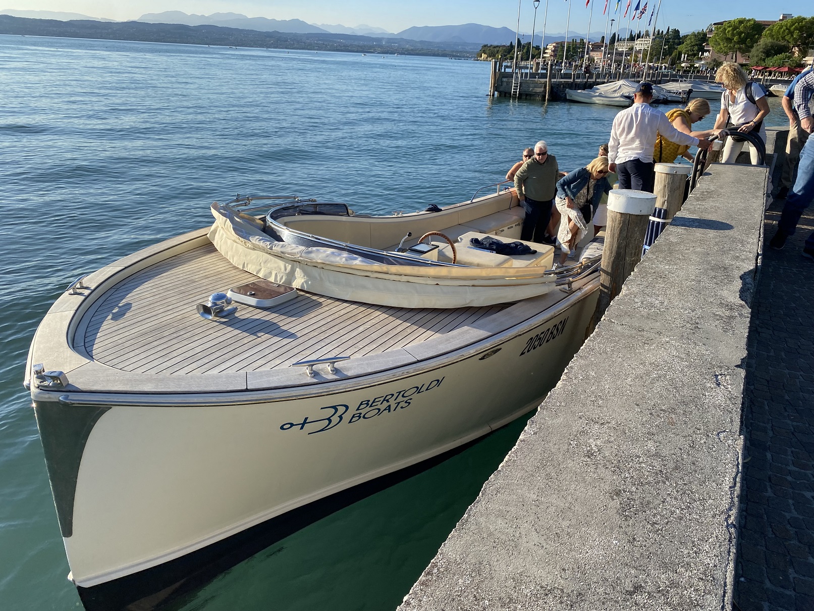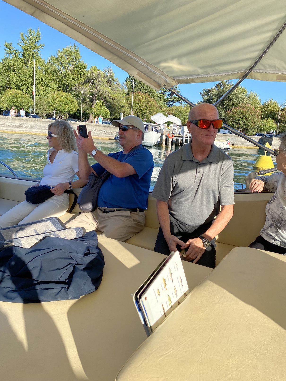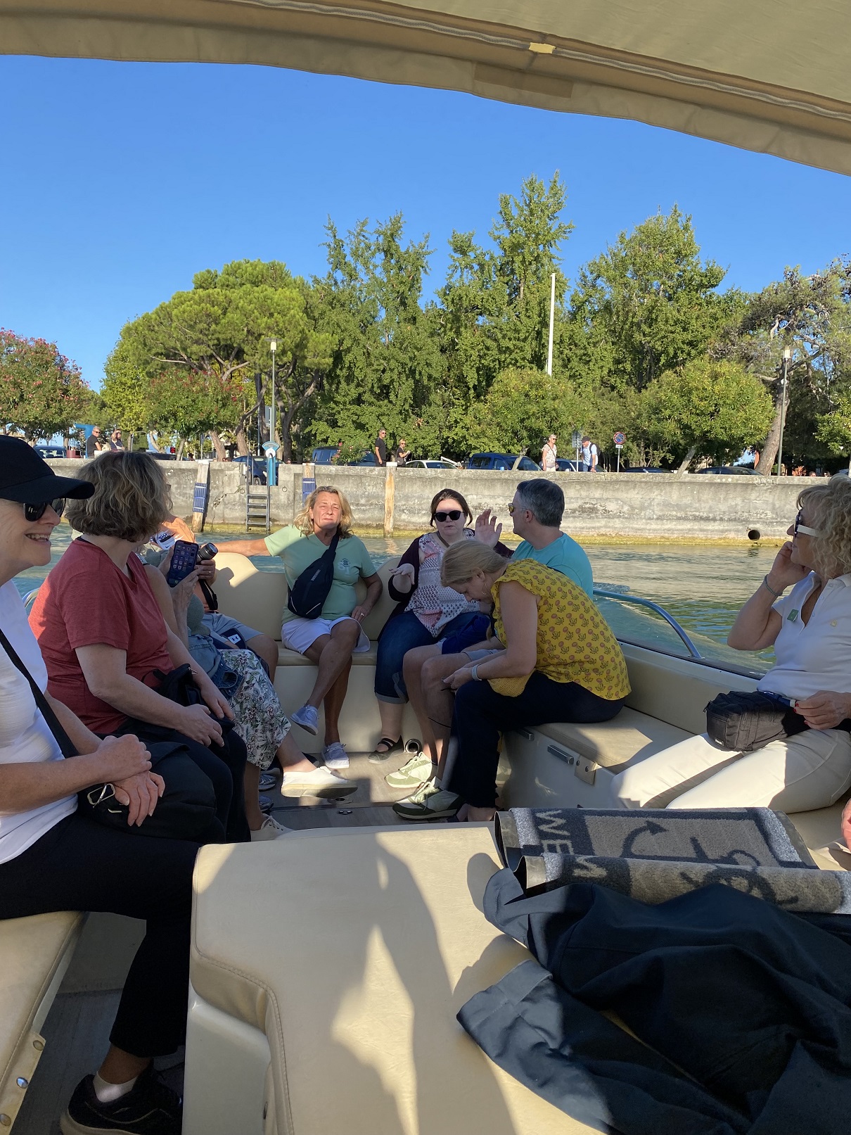 That afternoon, Carla has arranged an impromptu trip to Garda Lake. We all hop on this little boat...