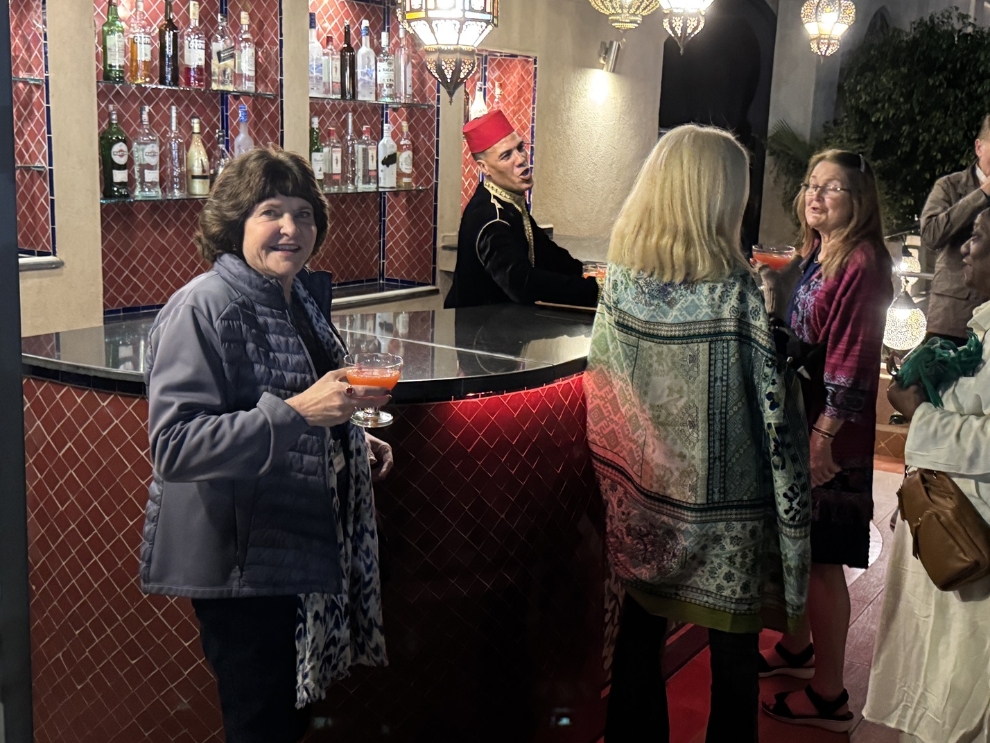 That rooftop patio bar behind Kimberly has a welcome drink for us.
