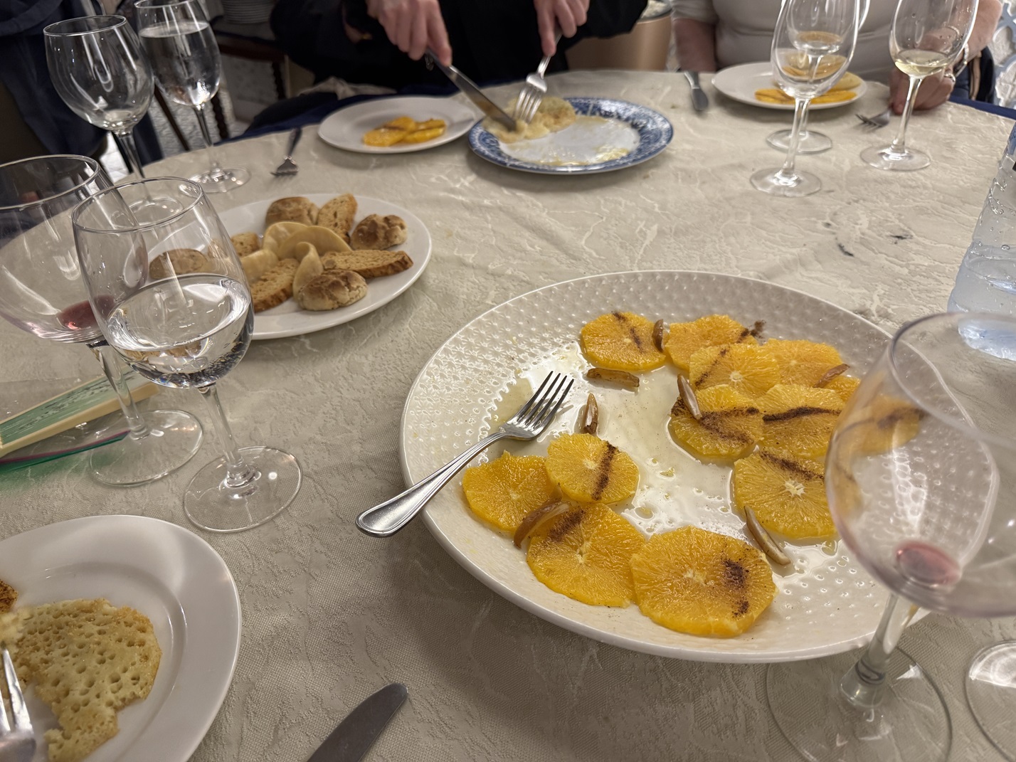 The dessert course with orange slices with cinnamon and other treats.