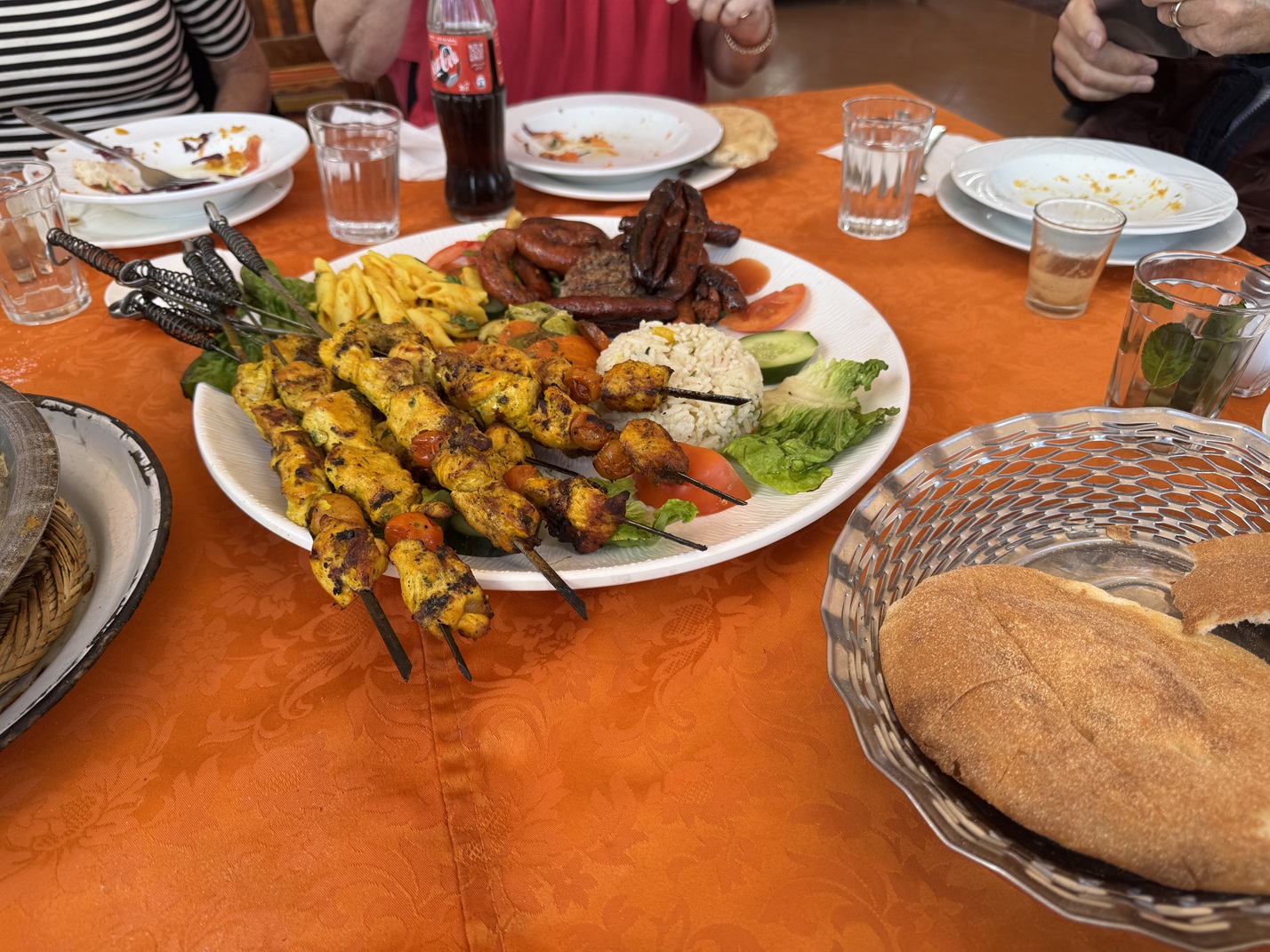It is served family-style, starting with a Moroccan salad...