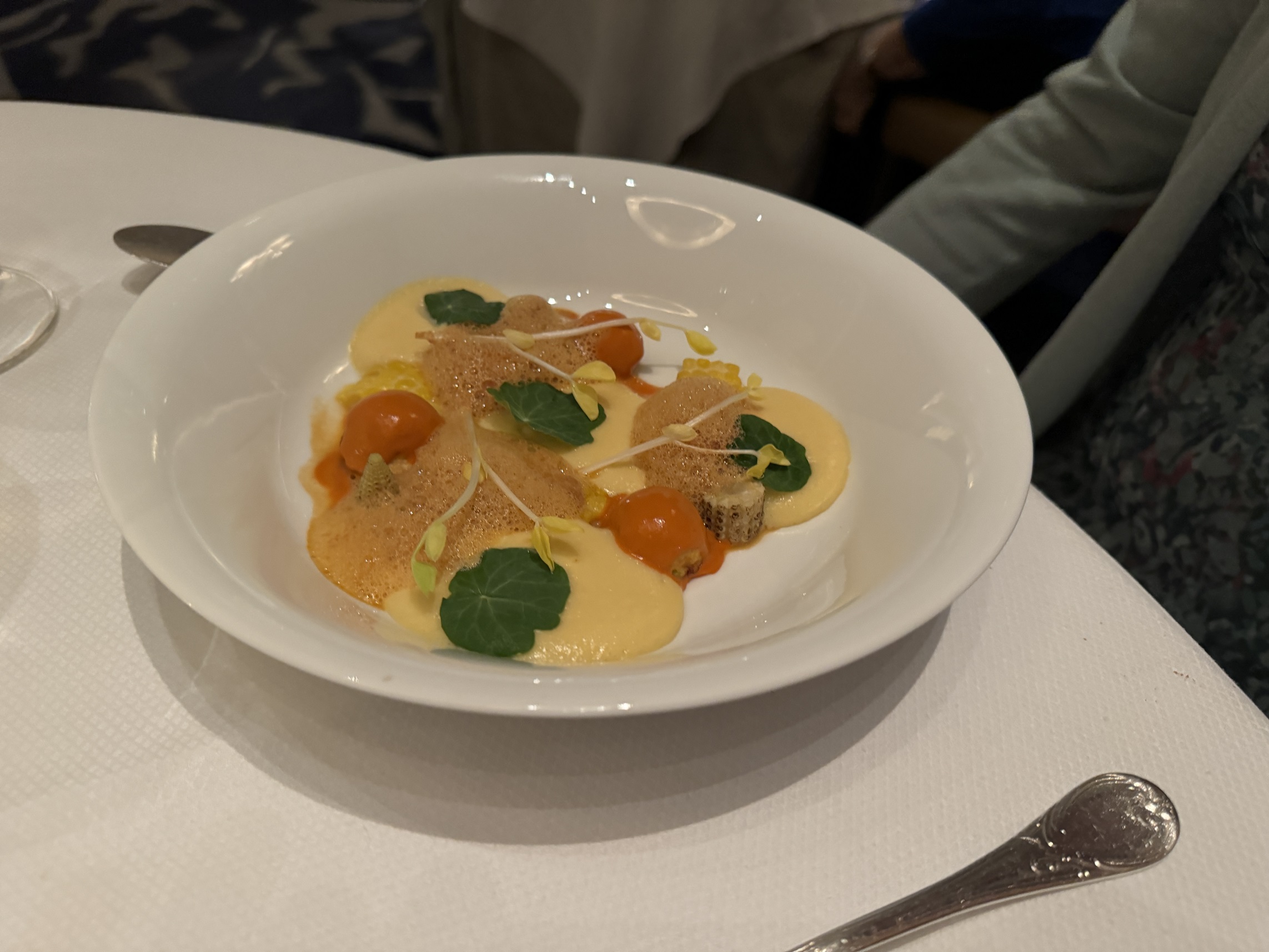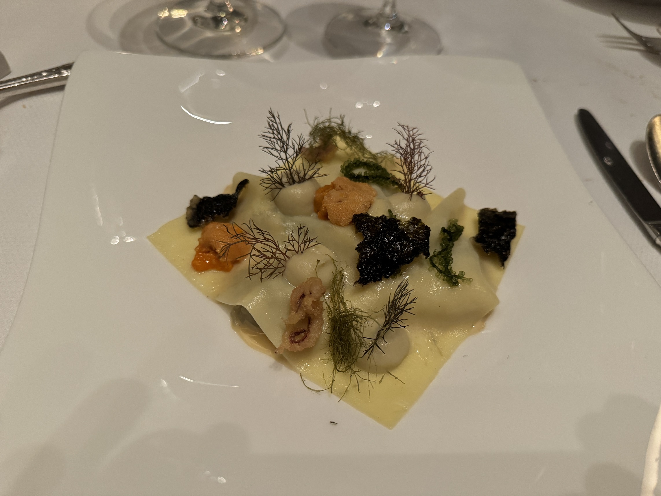 ...and Wade got the seafood fricasse "open raviolo" with a variety of things on top.