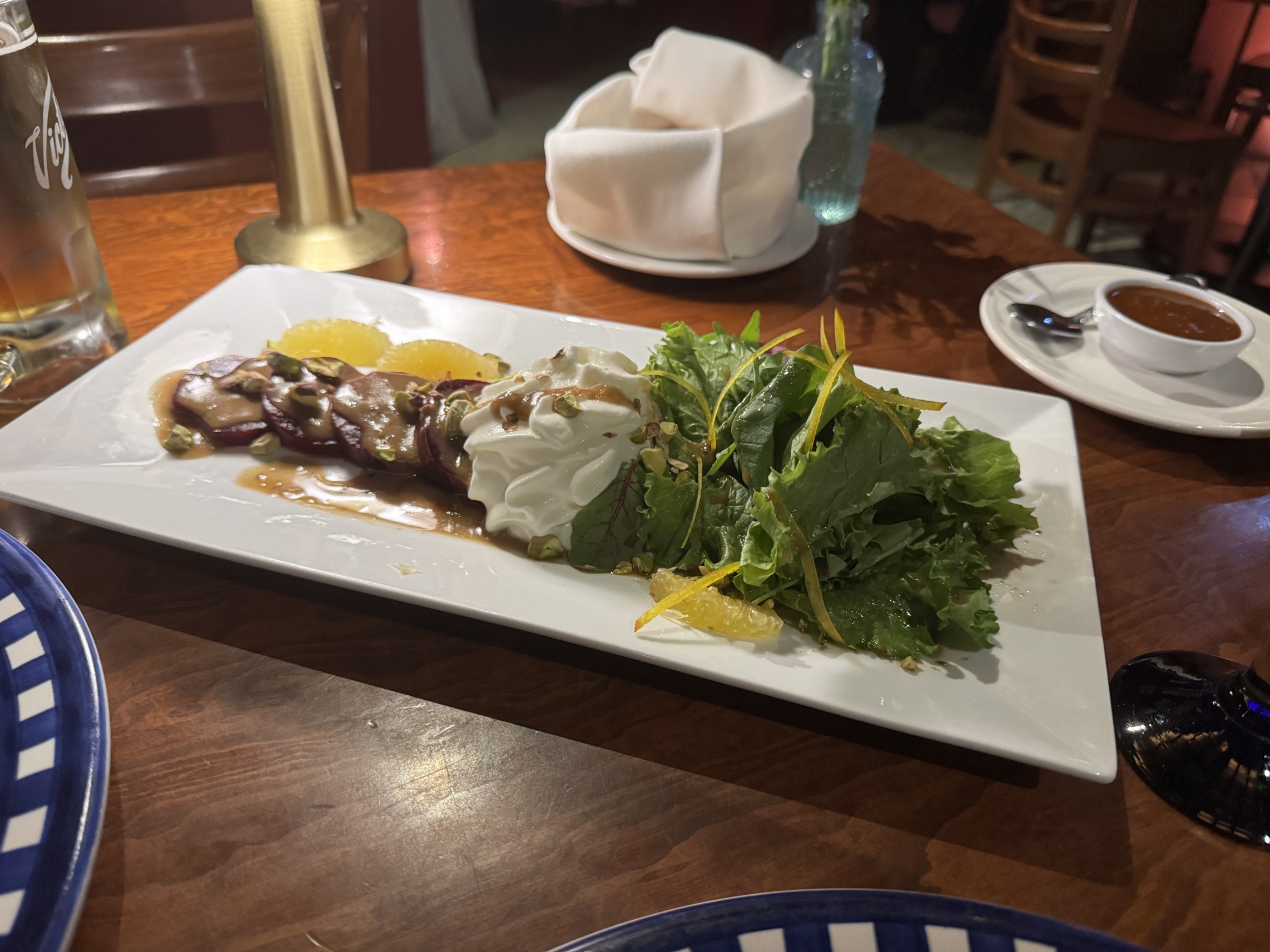 Our appetizer was a delicious beetroot salad with goat cheese foam and arugula.