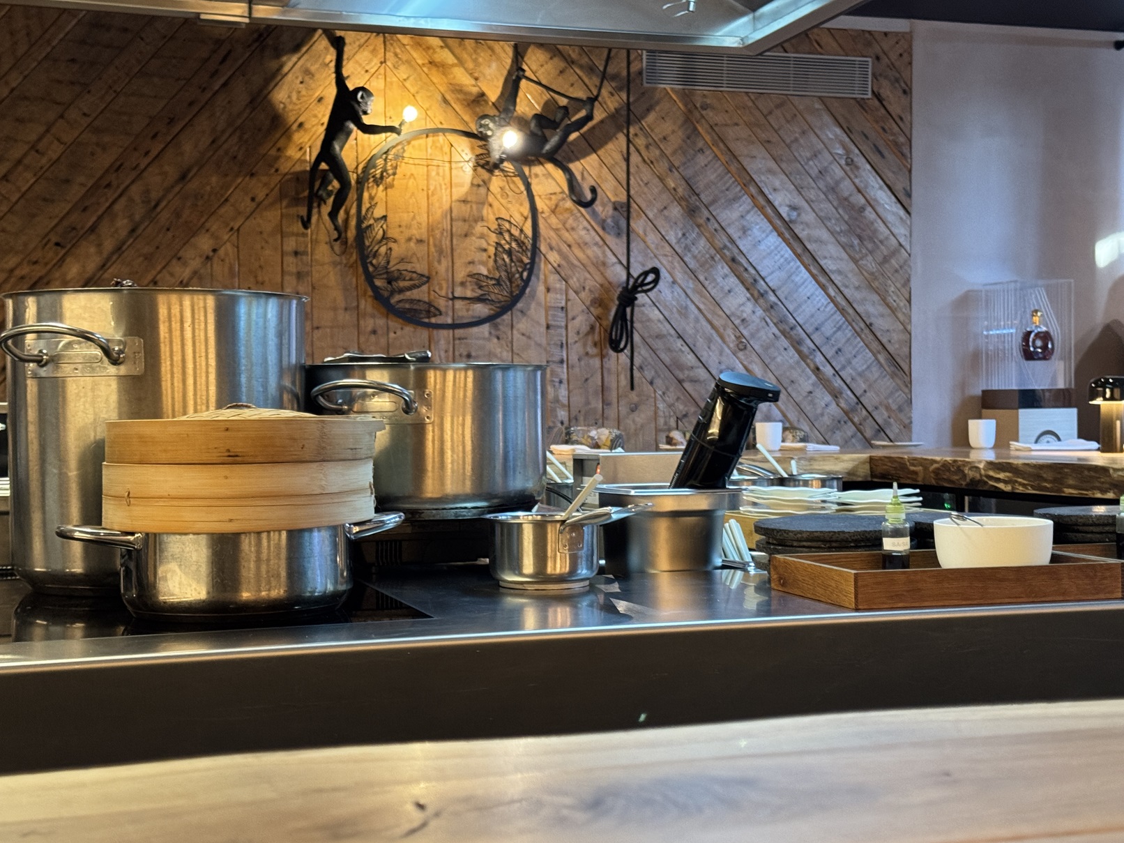 The two monkeys are in the background, behind the steamer and the stock pot.