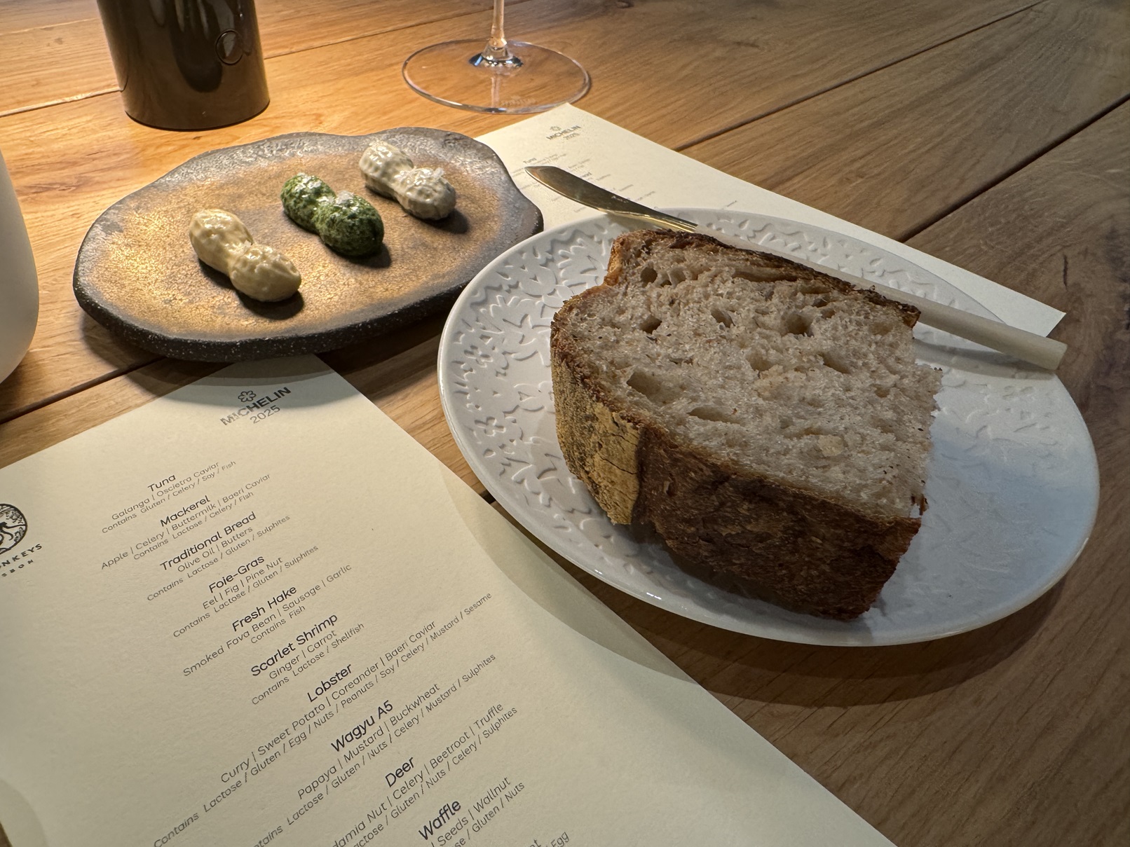 Our bread course. The little peanuts are different flavors of butter: onion, seaweed, and anchovy.