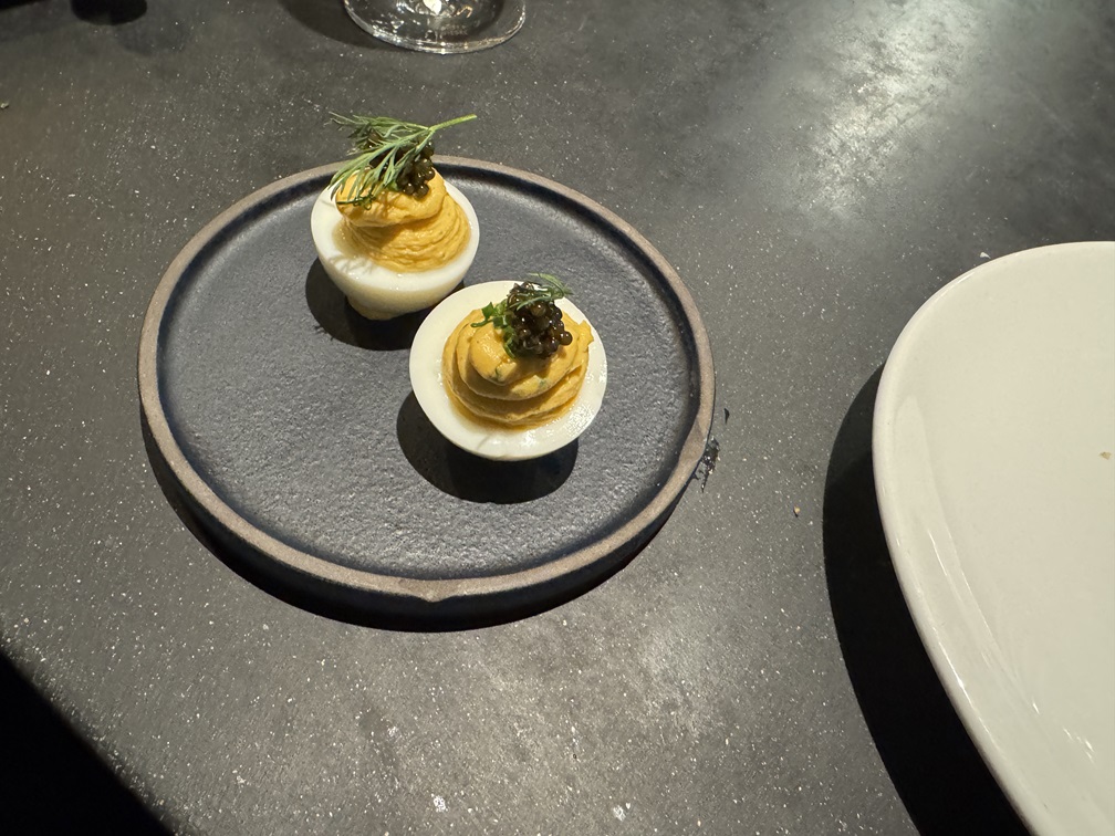 A deviled egg with caviar for an appetizer.