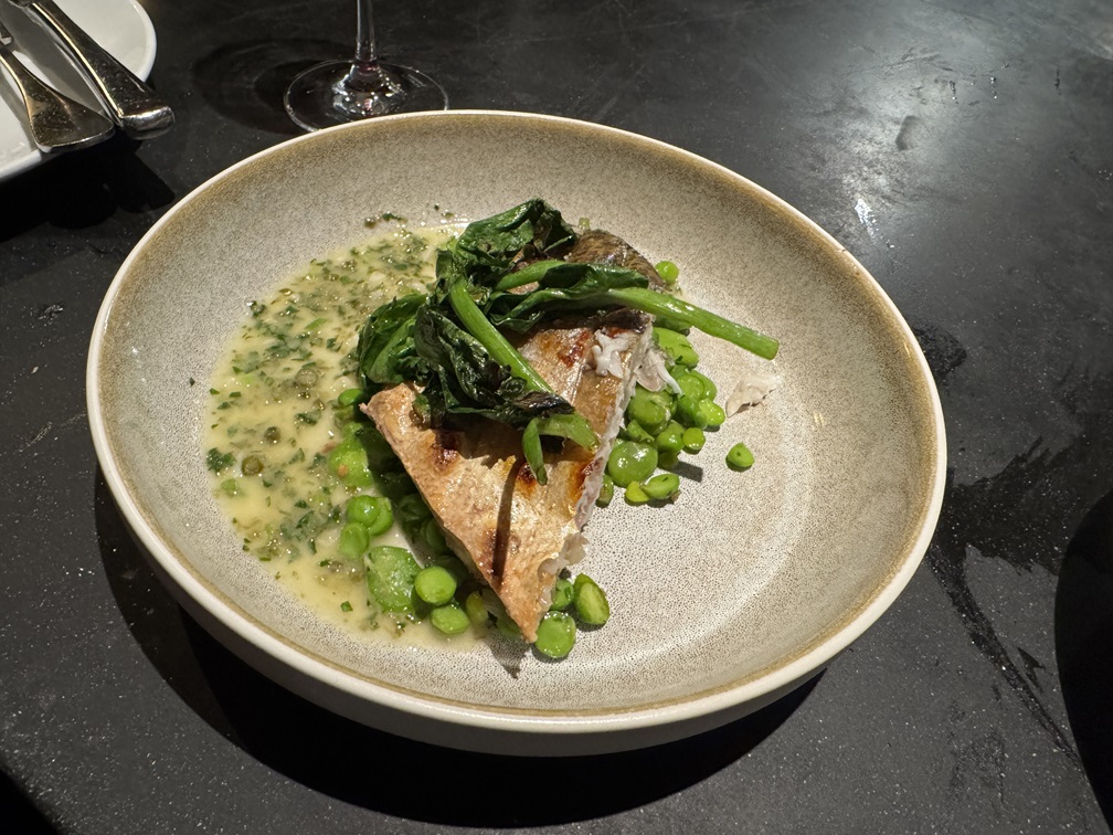 Grilled sea bass over peas and fava beans.