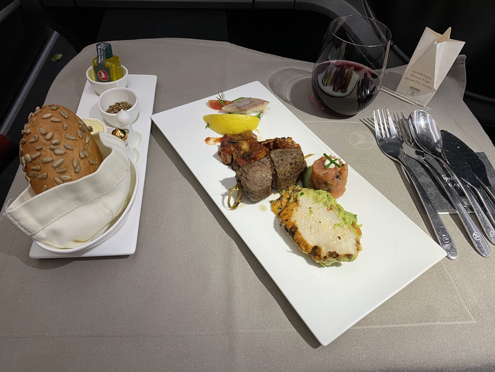 Nothing to report, but we did travel business class, so we had a nice meal. These are just the appetizers.
