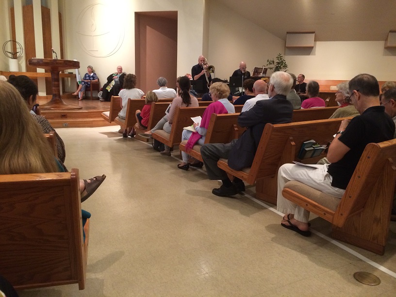 speaker, and a band with piano, organ, drums, bass, guitar, and jazz trombone.