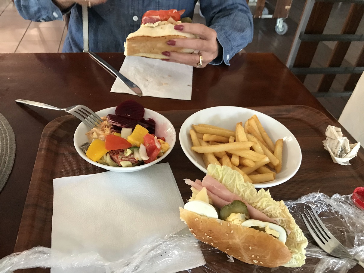 We settled on splitting this sandwich and fries, and getting a bowl of odd things from the "salad bar",