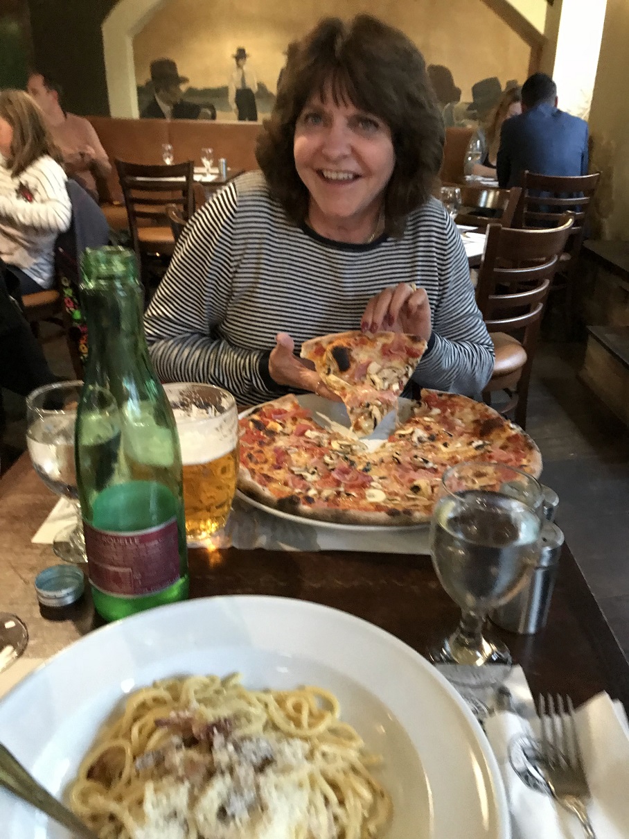 Kimberly with pizza, Wade with carbonara, and of course, more beer and wine.