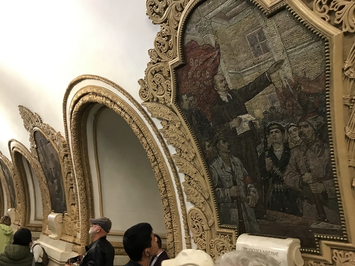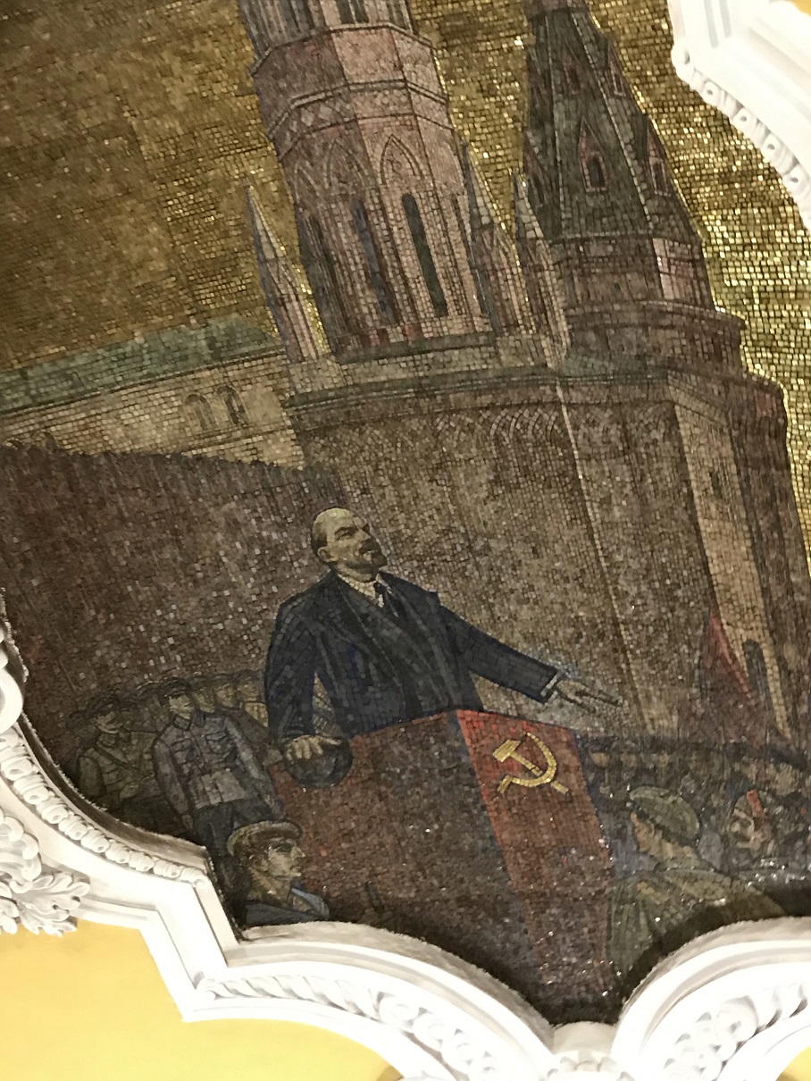 This is part of the ceiling detail, featuring gilded mosaics of Lenin and other scenes.
