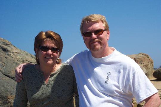 Mark in the foreground on the beach in Avalon, with the ship in the background.