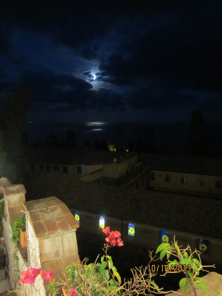 From our balcony at night, the full moon reflecting off of the Mediterranean.