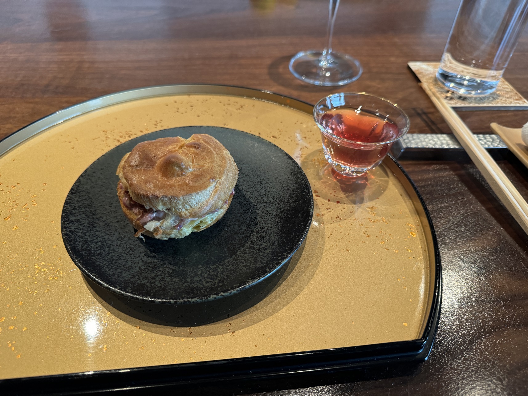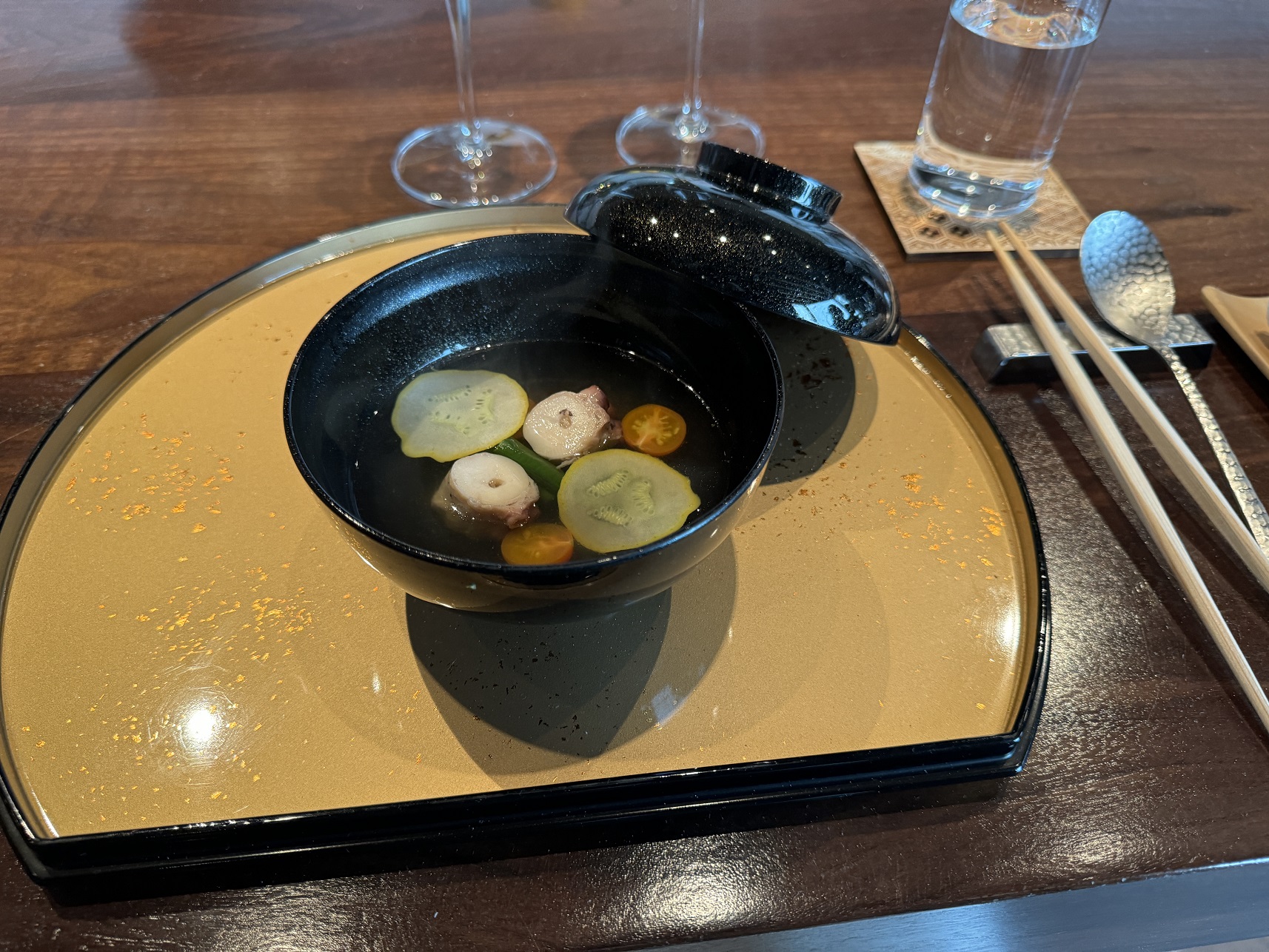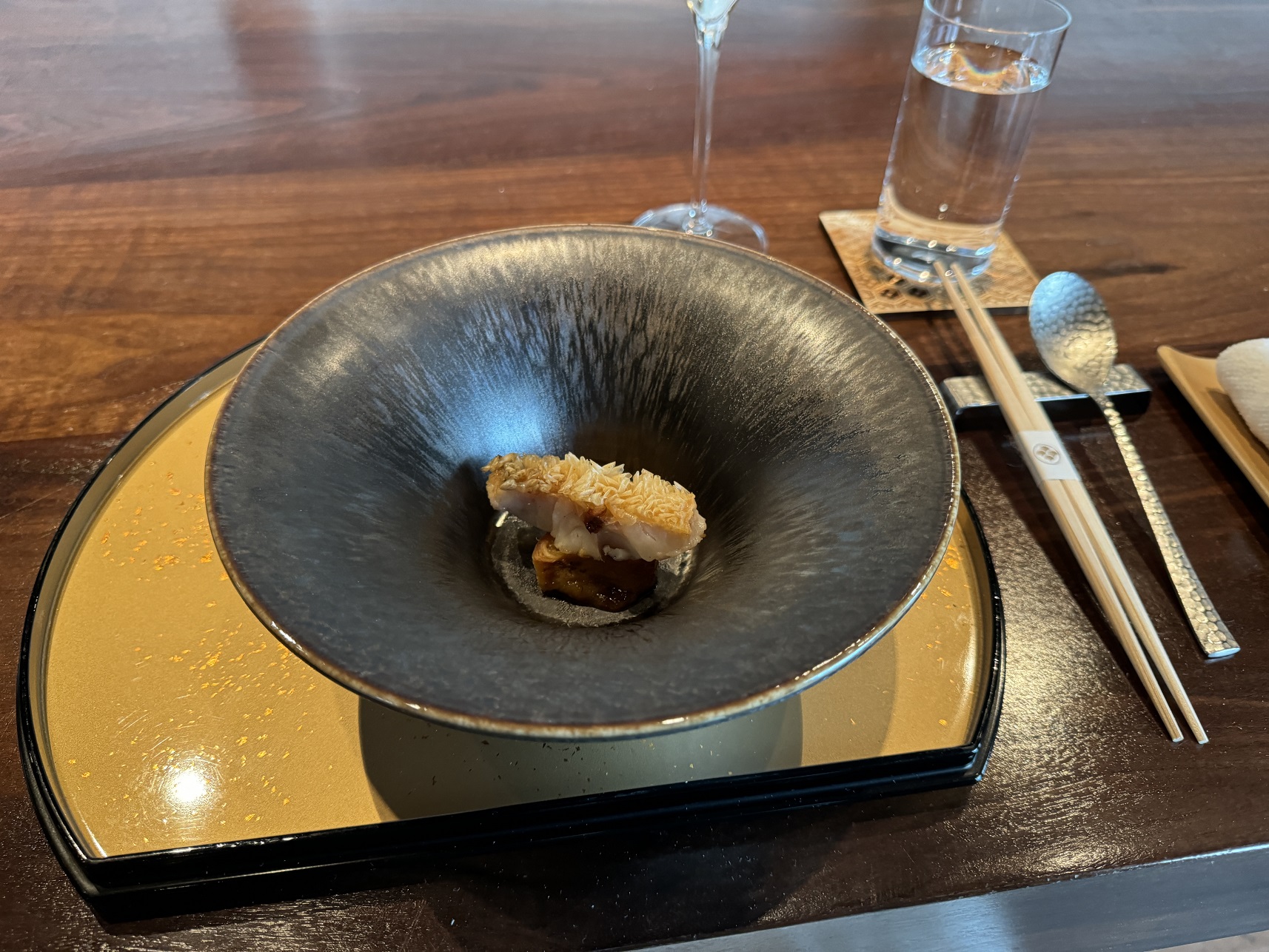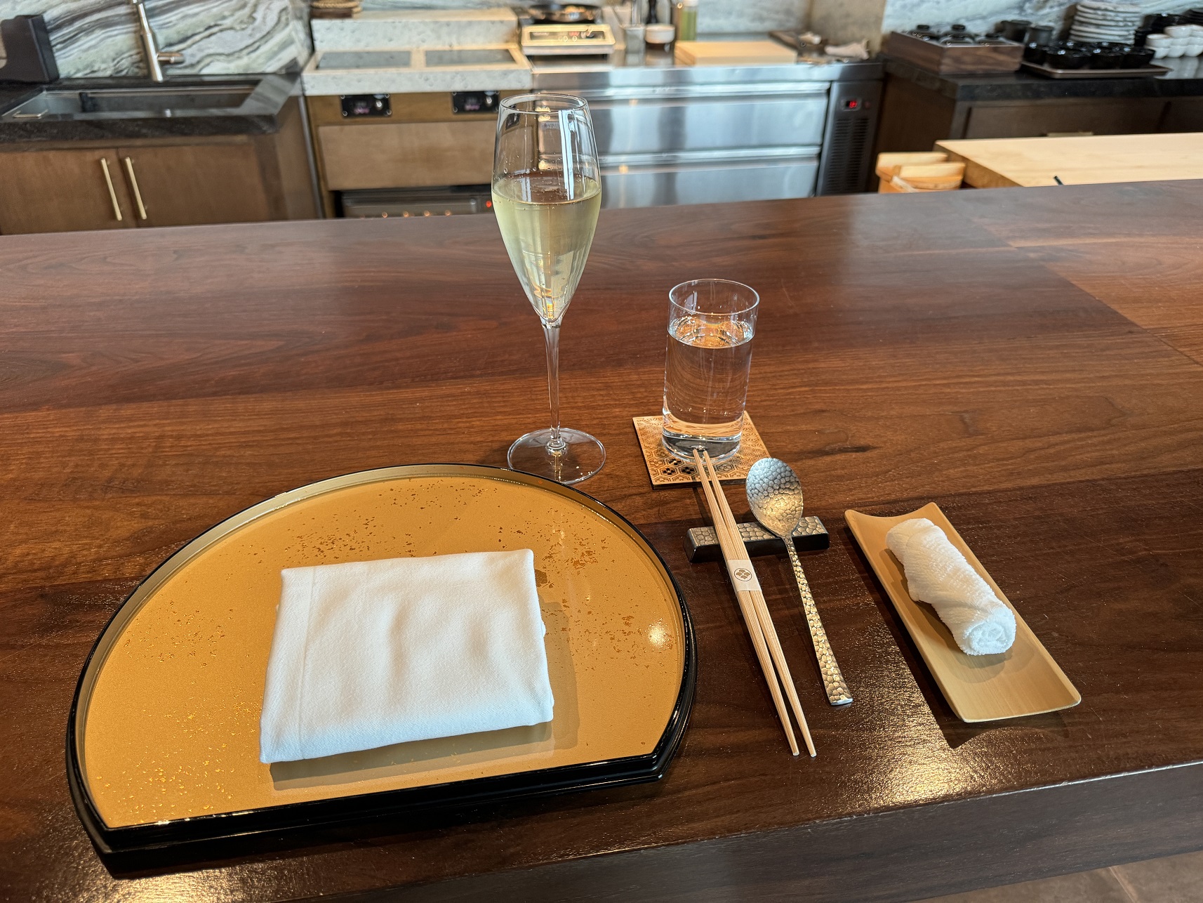 Our placesetting with a sparkling wine to start. Very traditional and Japanese.