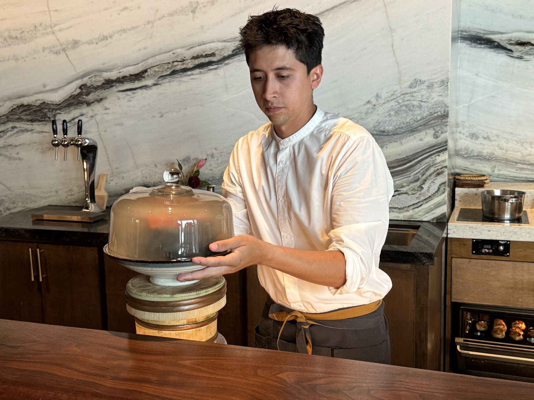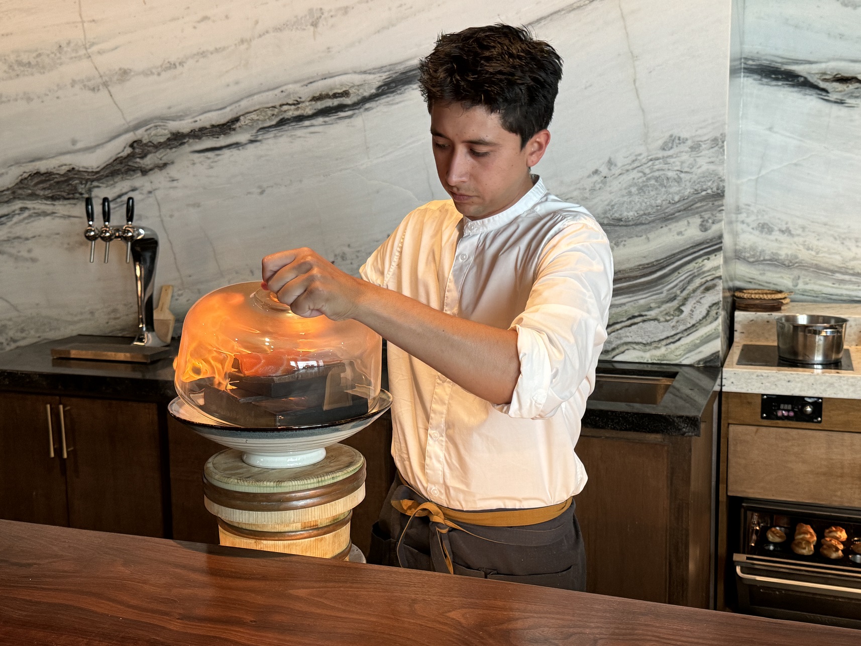 The assistant chef preparing a smoked king salmon, lighting the fire in the glass cover...