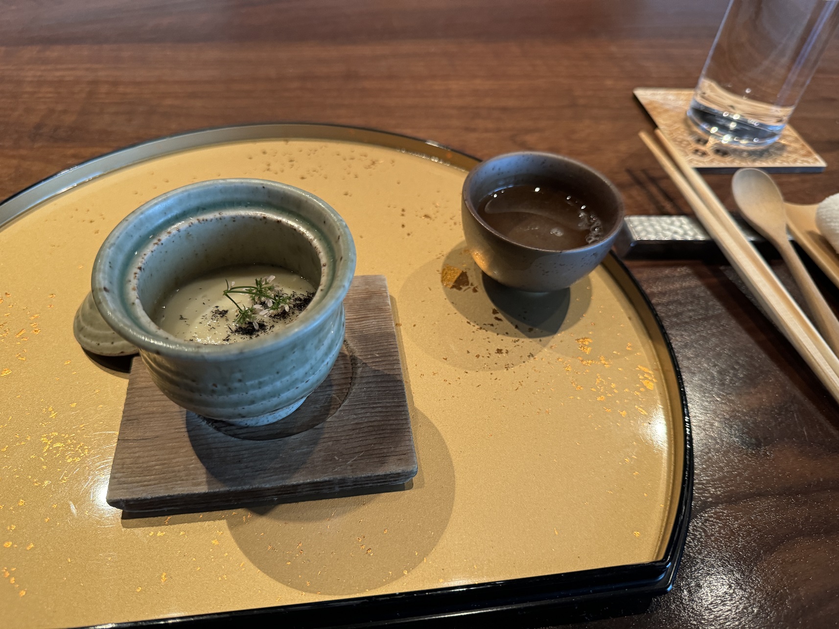 The hassun (expression of the season) course: chawanmushi with free range egg, corn puree, and husk ash.
