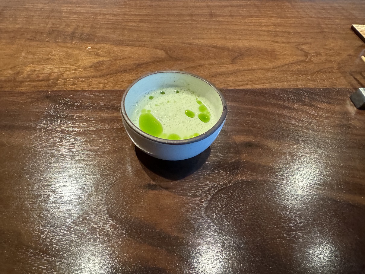 The wan-moso (soup) course: edamame soup with red shiso oil. Only OK after the crazy nigiri course.
