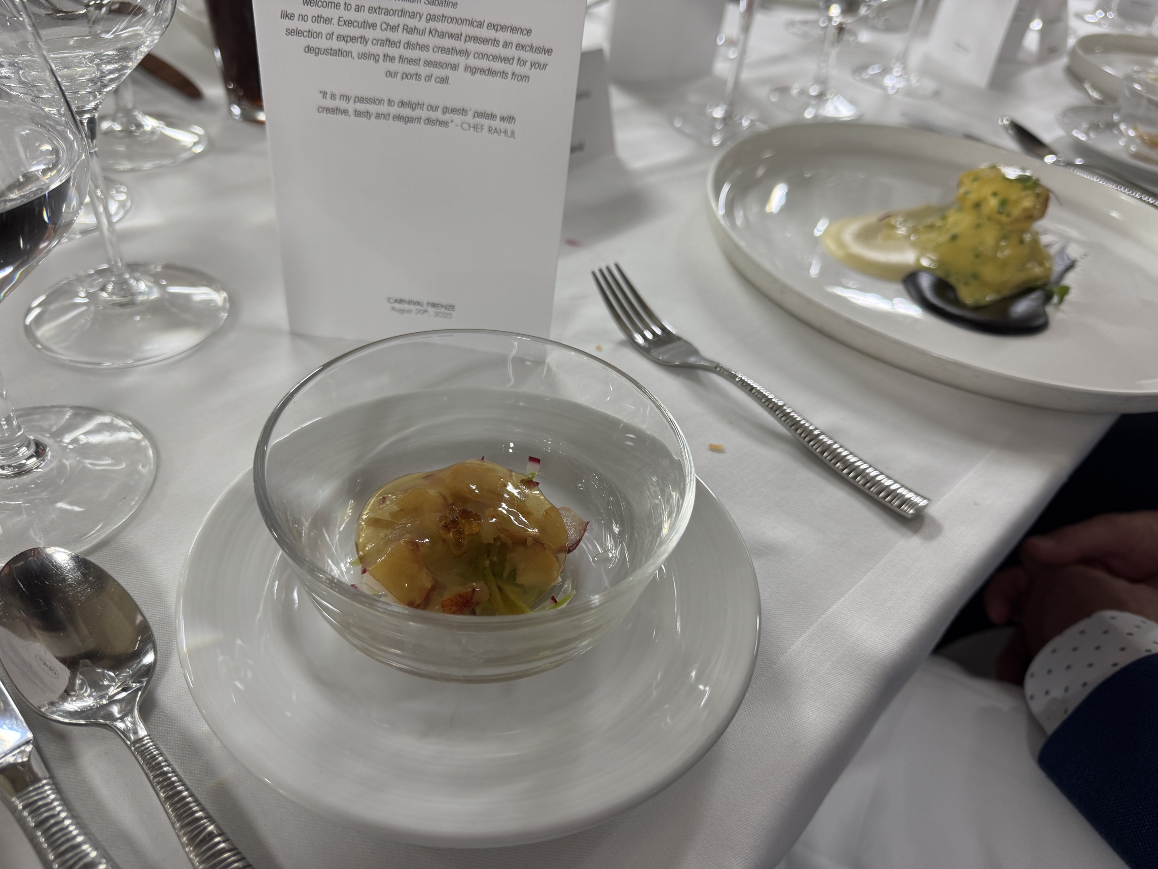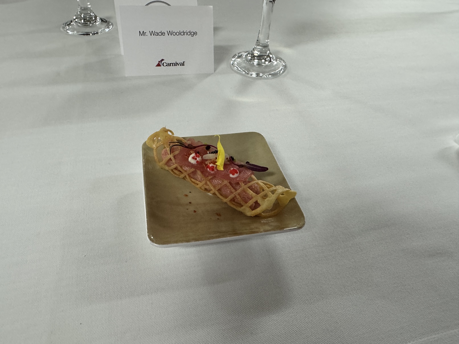 We start with a tuna appetizer wrapped in a toile.