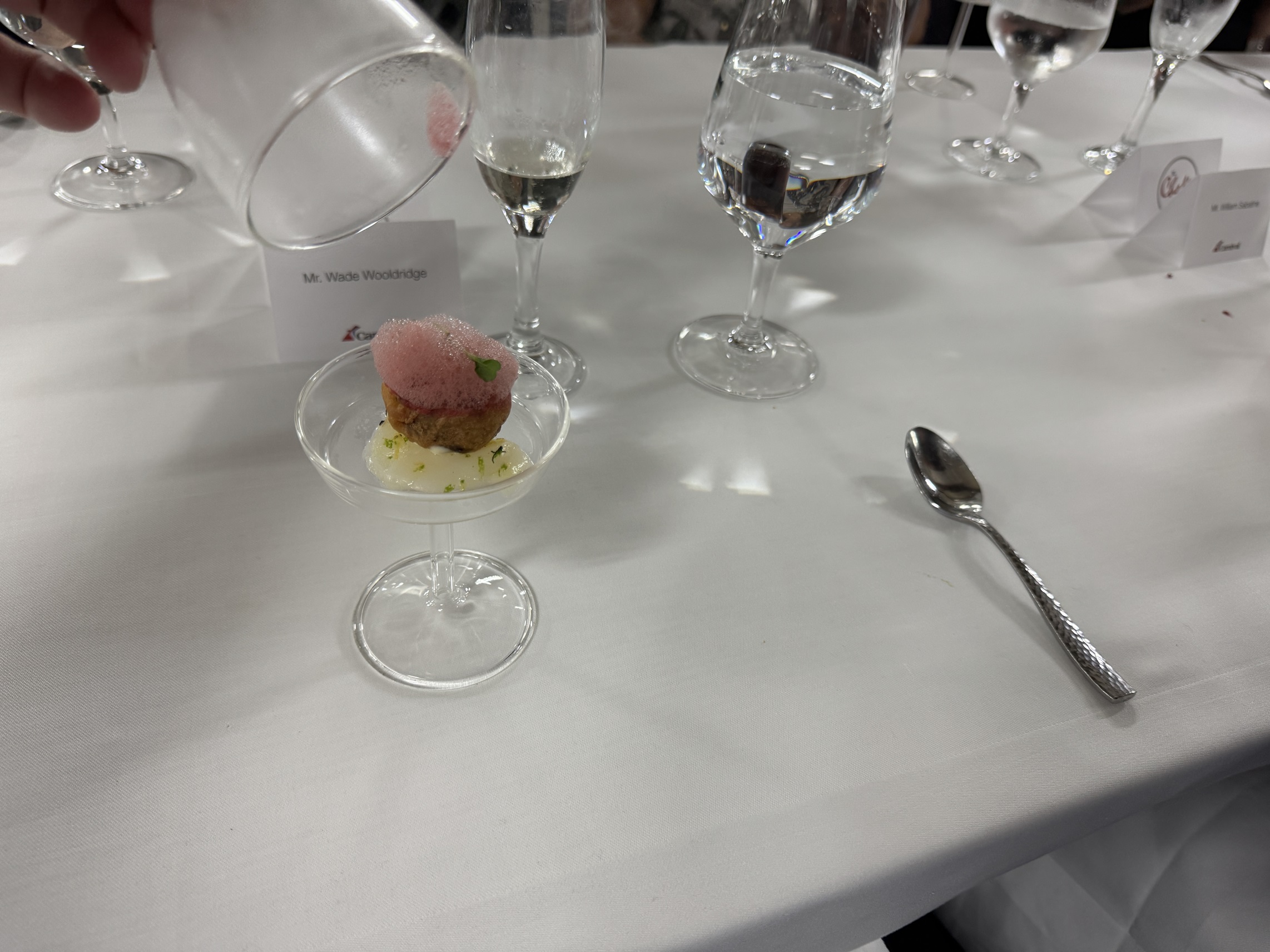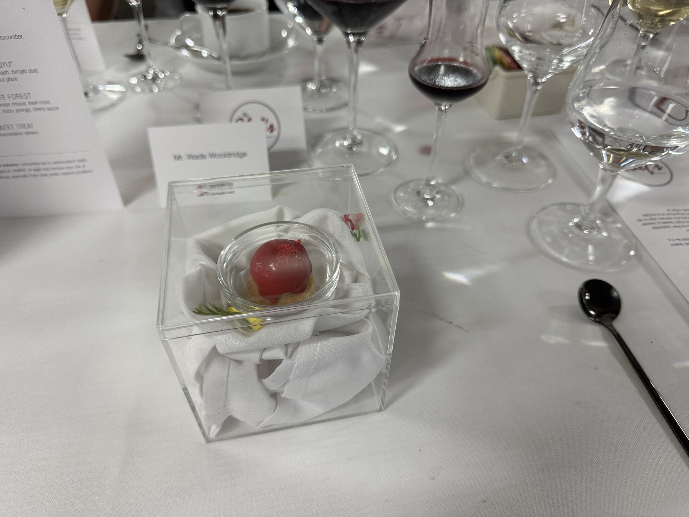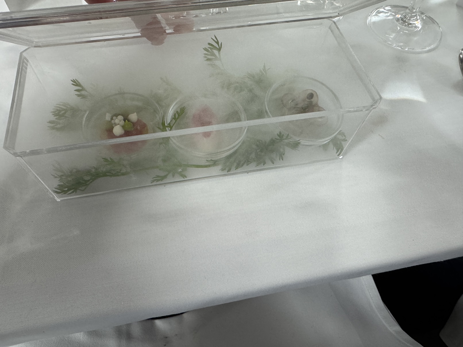 We end the first set of courses with a palate cleanser served under glass with smoke.