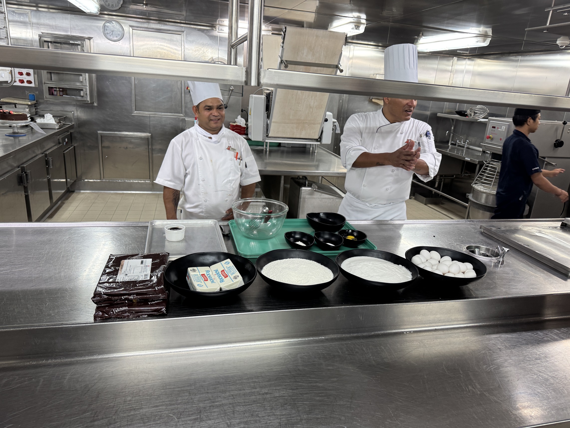 Over at the baking station, a pastry chef takes us through making their signature melting chocolate cake.