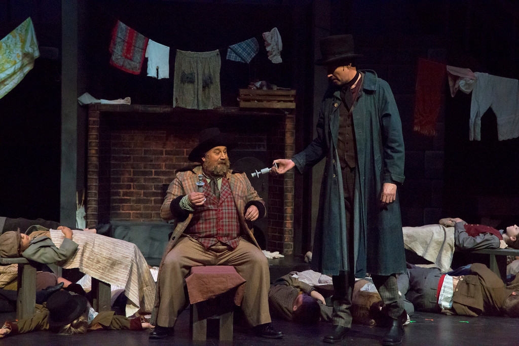At the Three Cripples, Sykes confronts Fagin to go and get the boy before he rats on them.