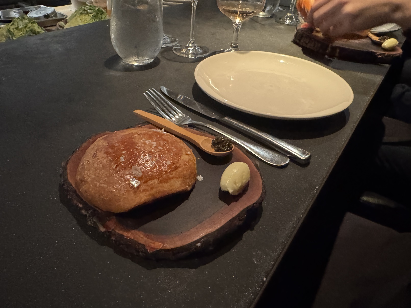 The traditional fresh-from-the-over brioche bun, this time with a spoon of caluga caviar. The bread