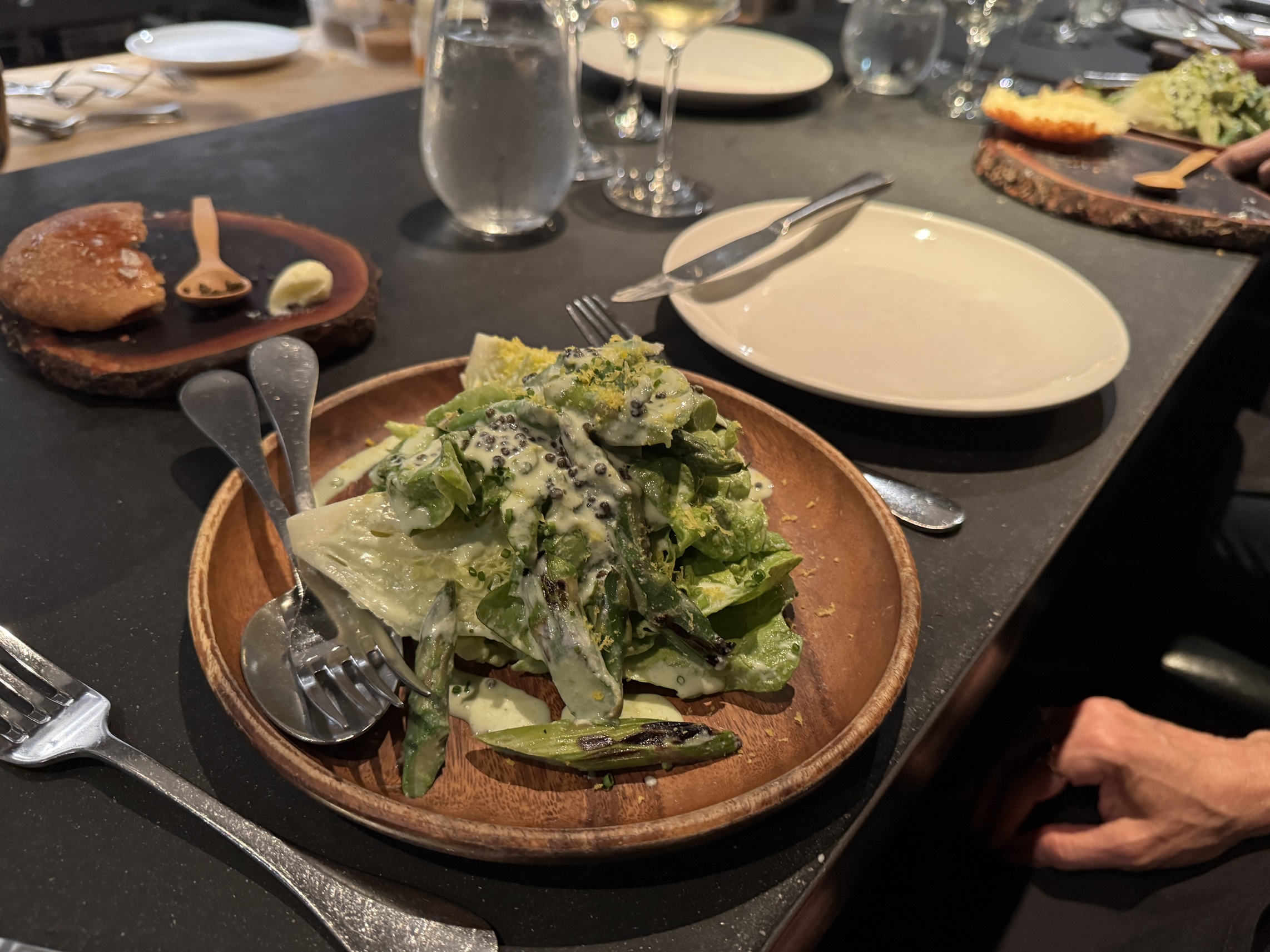 A salad of field butter lettuce and grilled asparagus, with a buttermilk dressing with caluga caviar.