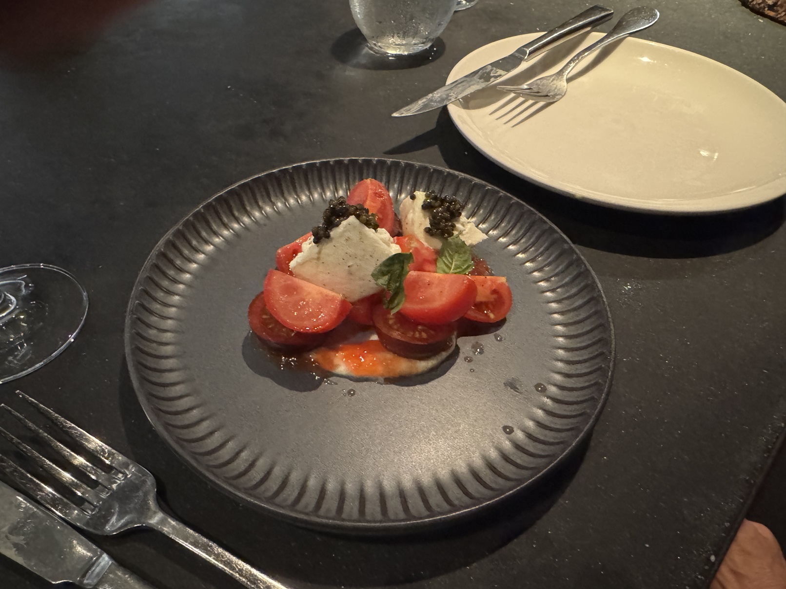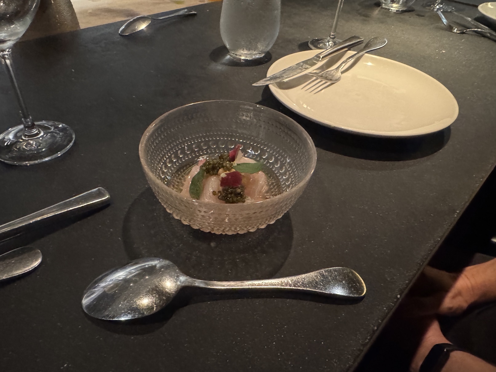 A dry-aged hamachi crudo course. They dry-age their own fish in-house. One highlight is the tomato