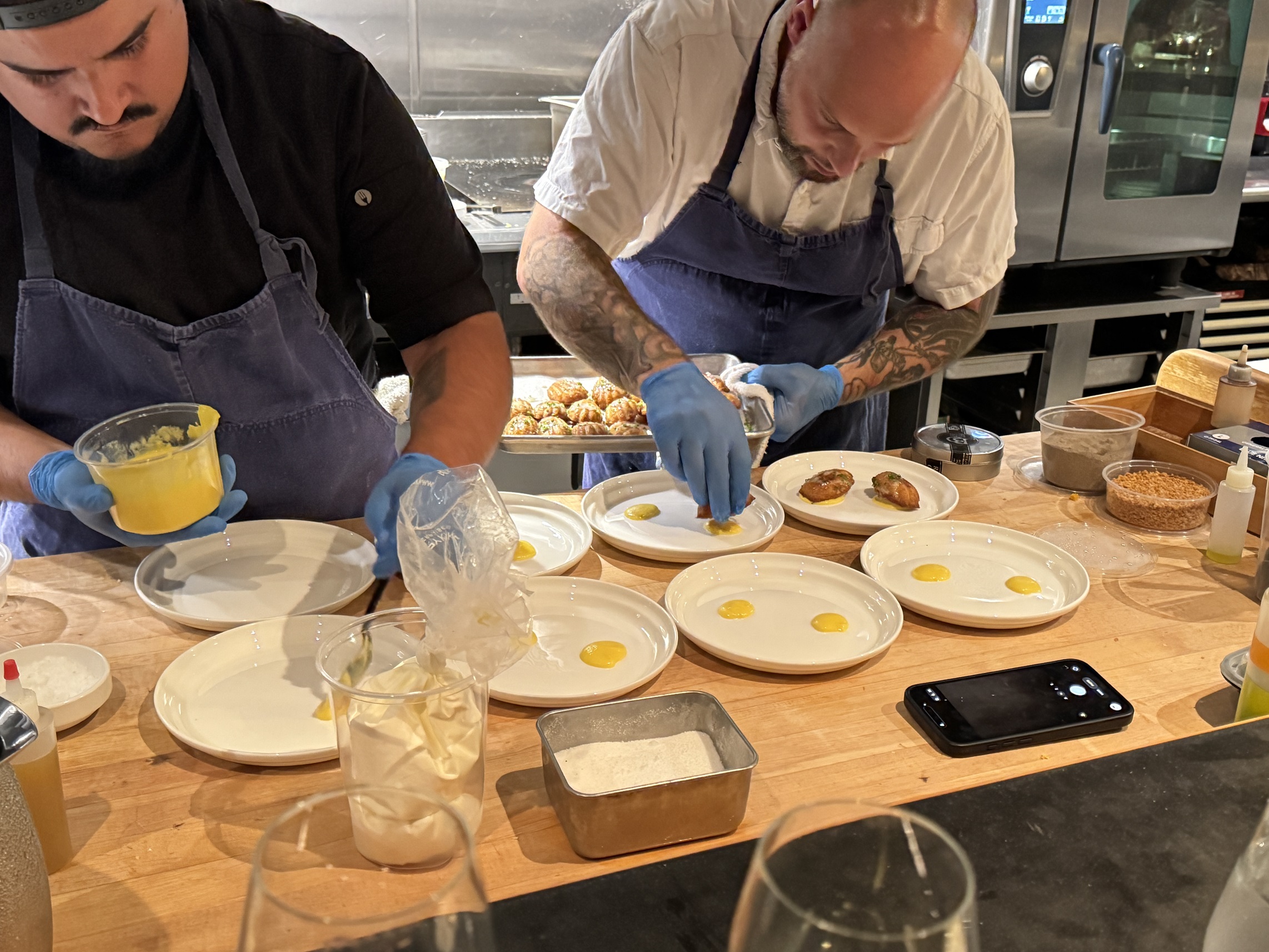 Assembling the next course, which includes soft-boiled quail eggs in the center.