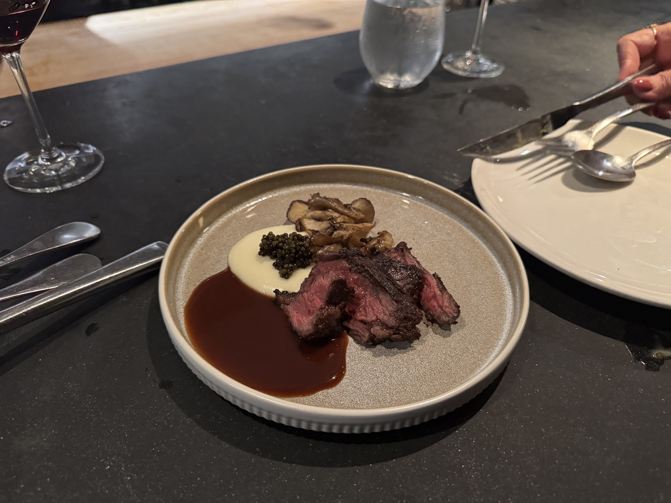 A hanger steak course with Robuchon whipped potatoes, maitake mushrooms, and pan jus. The buttery