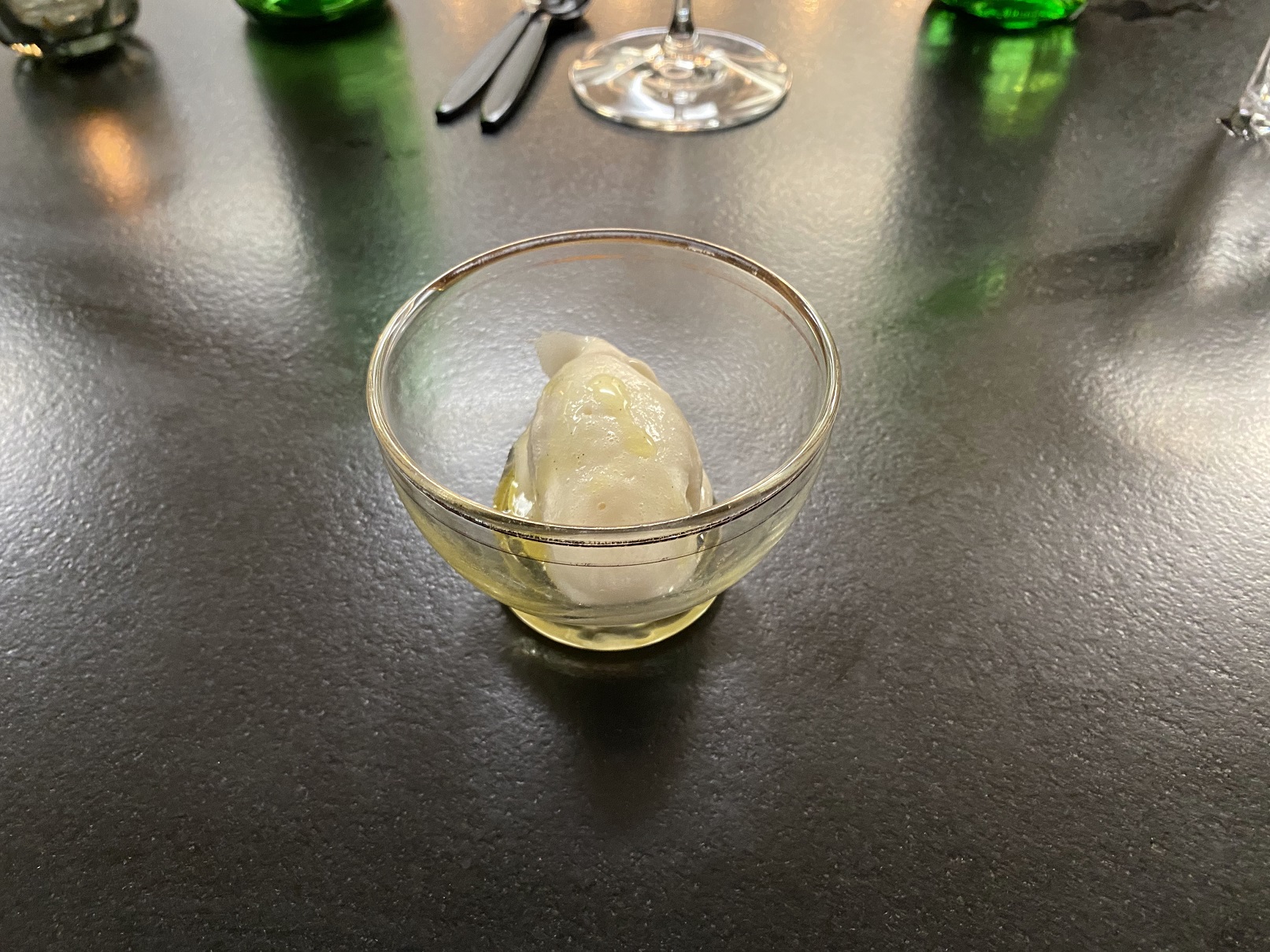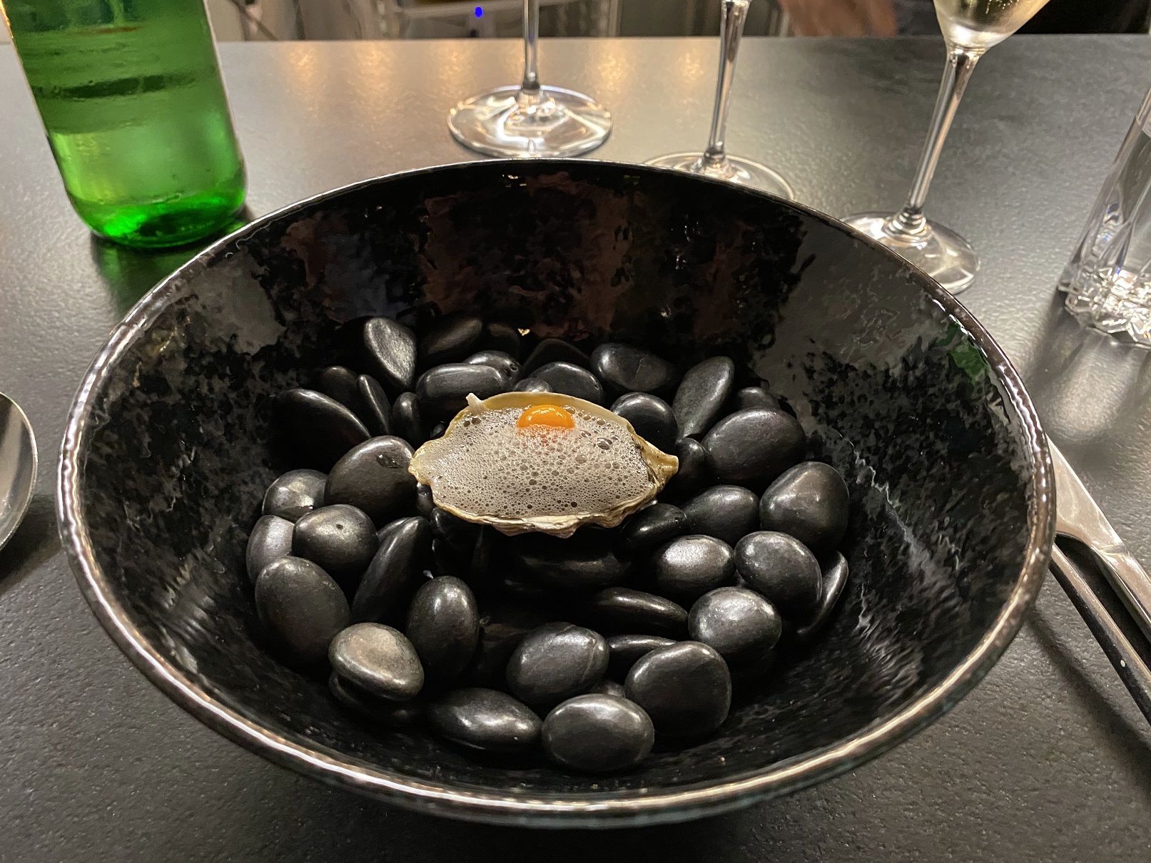 Oyster with confit sungold, fermented strawberry, and indigo bubbles.