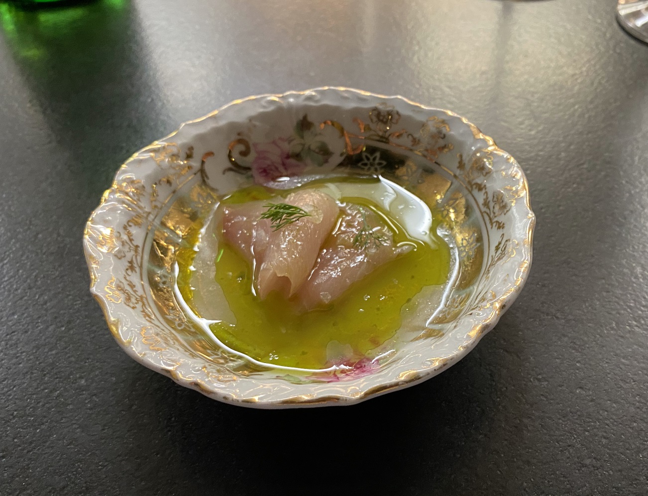 Kimberly's favorite: hamachi in a sour apple and ginger liquid, with drops of shishito pepper oil.
