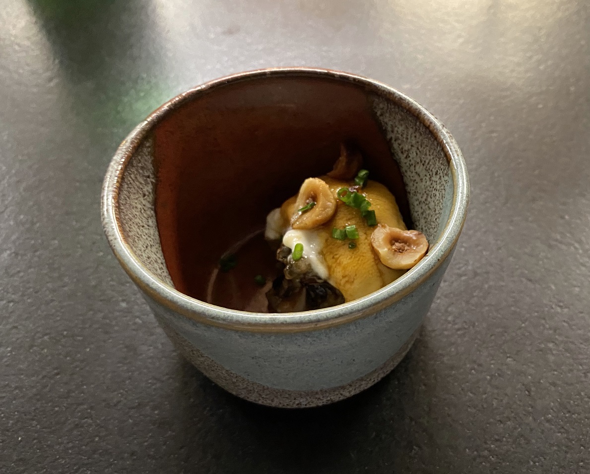 Eggplant stracciatella with uni, grapefruit, and hazelnuts.