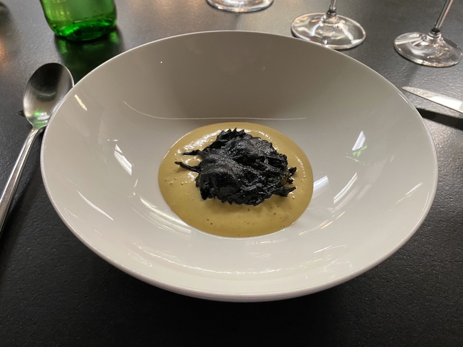 Scallop fried in shiso and squid ink, sauce of smoked nectarine and fermented yeast.