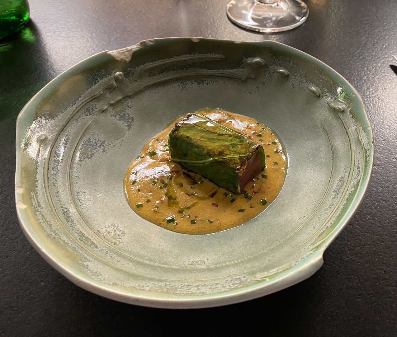 Wade's favorite: ahi tuna belly wrapped in collard greens, with a sauce Vin Jaune. The saucework