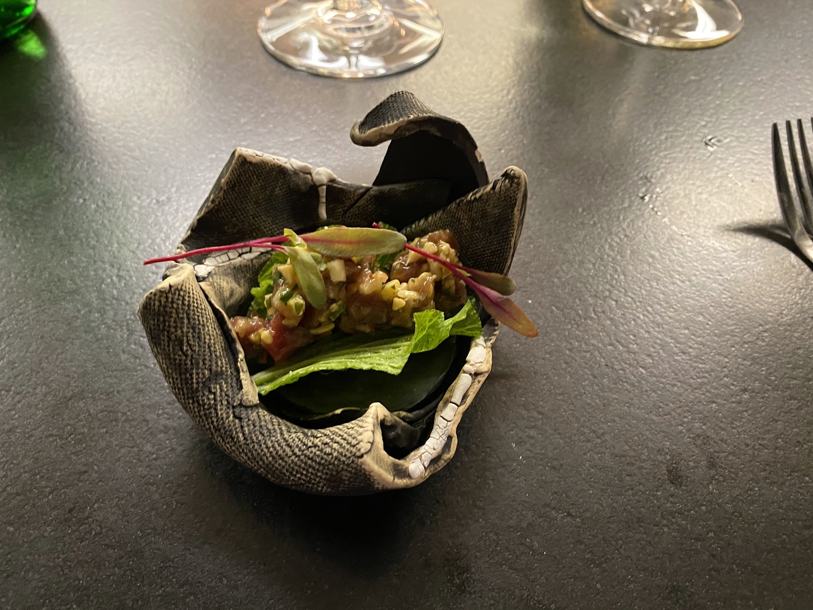Wagyu beef tartare wraped in mustard greens with six-year-old Beemster cheese. Like many courses,