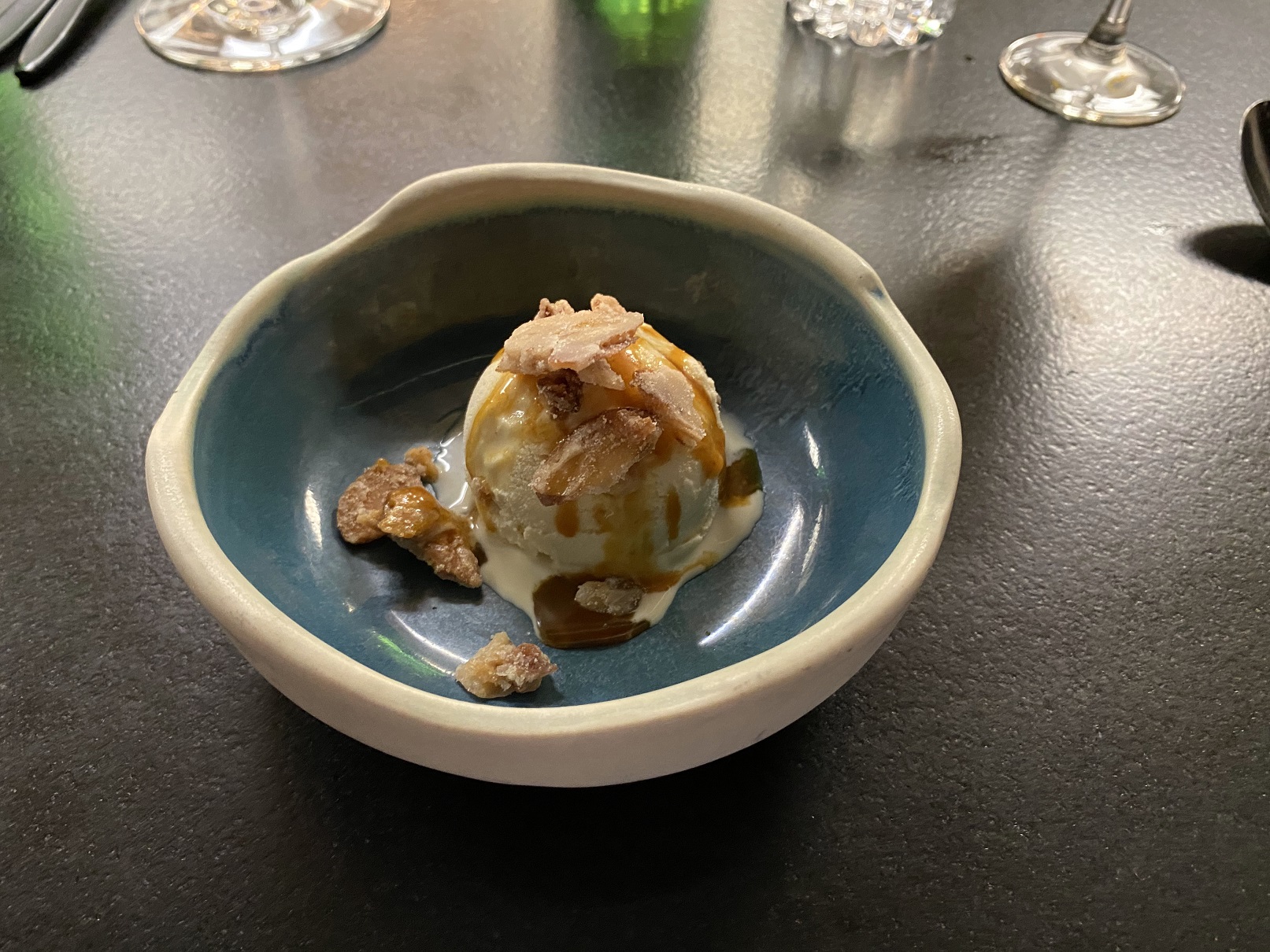 Our favorite dessert: gelato with a hint of pineapple and miso, and these candied almonds that were